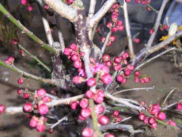 小さな紅梅。蕾もかなり膨らんだ。1輪咲いている!