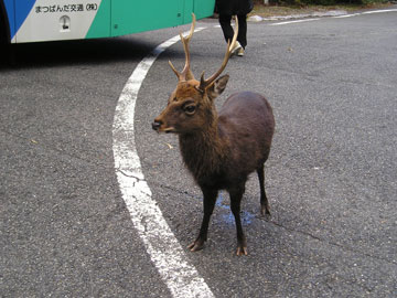 バスを出迎えてくれる屋久鹿のひろし君。トイレの最中です。