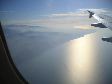 冠雪した山々が見えたので、スチュワーデスさんに何処ら上空か聞くと、「山がたくさんありますね。どこでしょうかね」とにこにこしている。「そろそろ着陸体勢にはいります。地図がありますよ」と座席前のポケットを指す。まいったネ。